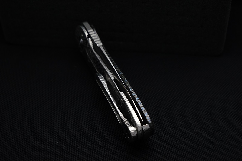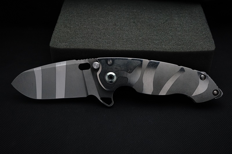 | EXTRAS: | Stainless Steel Lock Bar Insert. Black Timascus Back Spacer and Ti/Zirc Damascus Pivot Collars. | ||